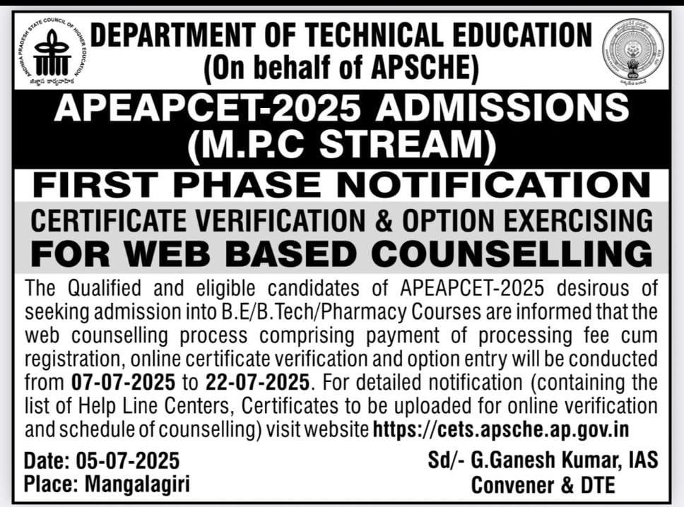 APEAPCET-2025 ADMISSIONS (M.P.C. STREAM) FIRST PHASE NOTOCATION ANNOUNCED