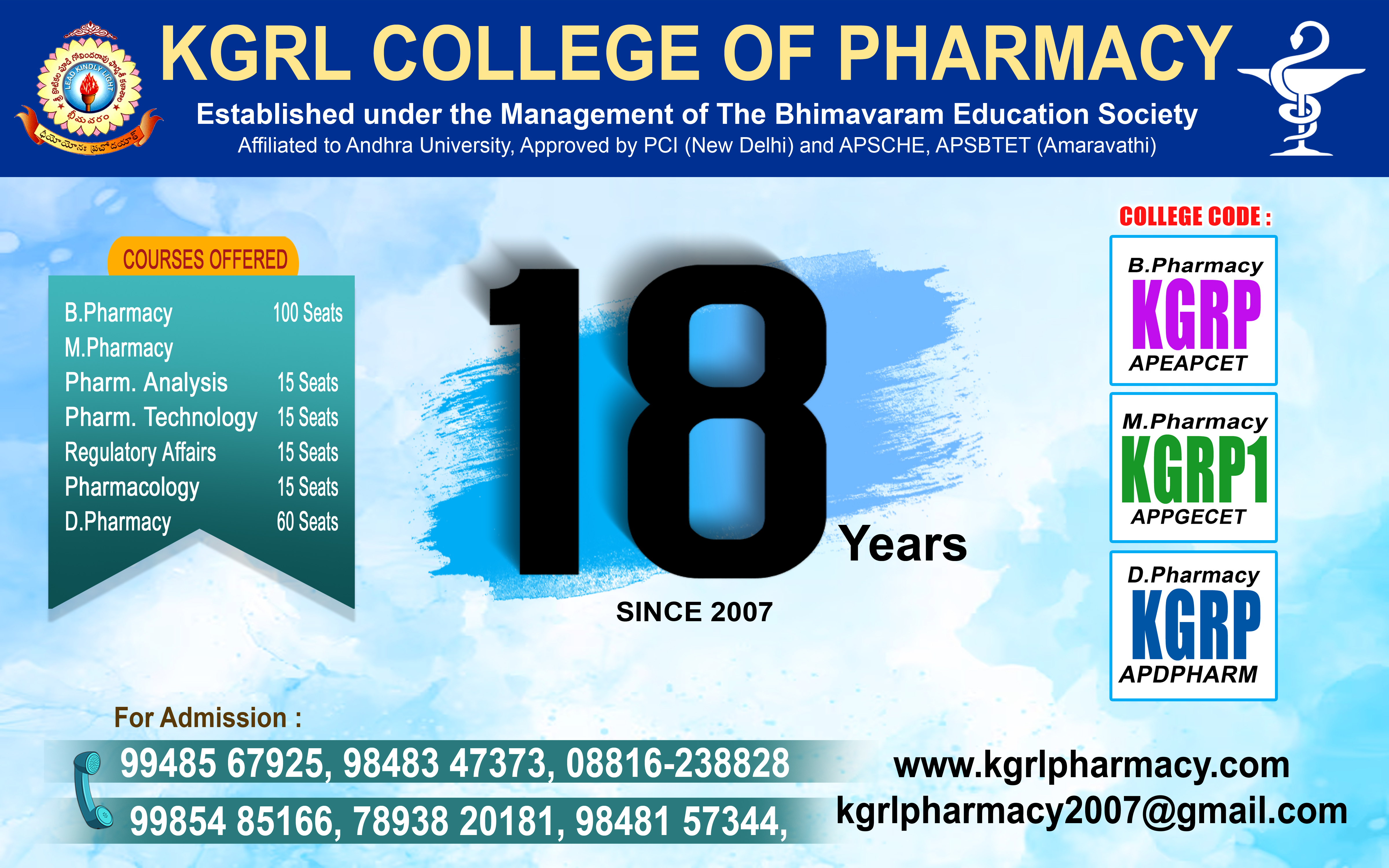 K.G.R.L.College of Pharmacy is established in 2007 under the Aegies of The Bhimavaram Education Society with the main objective of providing world class education in Pharmacy with a mission to make it a centre of excellence ensuring high quality & value based education and unwavering commitment to provide quality teaching and innovative research, by transforming young talented students into Global Pharmacists.