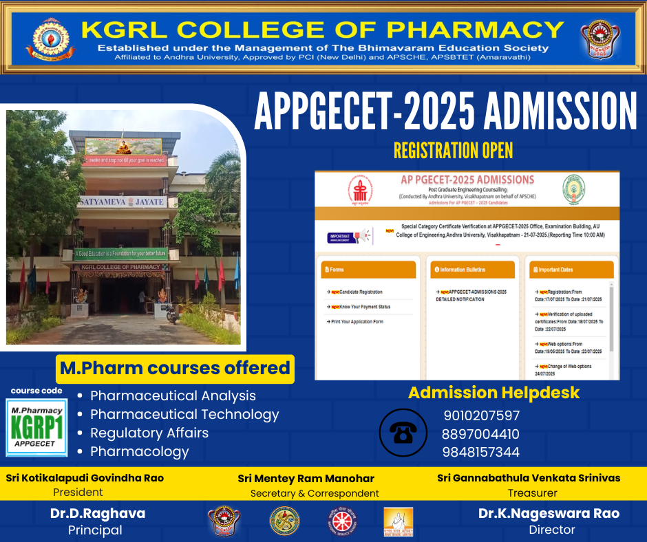 K.G.R.L.College of Pharmacy is established in 2007 under the Aegies of The Bhimavaram Education Society with the main objective of providing world class education in Pharmacy with a mission to make it a centre of excellence ensuring high quality & value based education and unwavering commitment to provide quality teaching and innovative research, by transforming young talented students into Global Pharmacists.